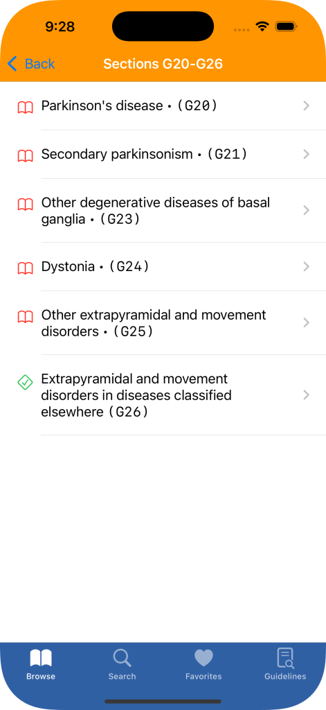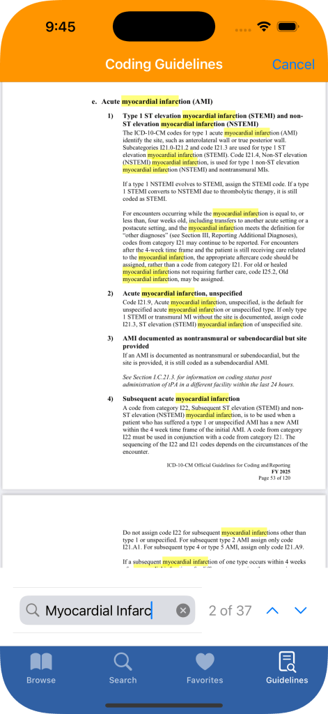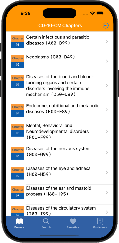 The Ascriva ICD-10-CM-2025 app provides three ways to locate ICD-10-CM codes: Browse, Search and Favorites. When you launch the app you will see buttons at the bottom of the screen to access each of these options (see below). The 4th button “Guidelines” opens a searchable version of the “Official ICD-10-CM Guidelines for Coding and Reporting”.