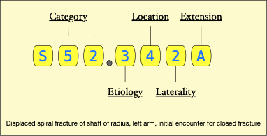 ICD-10-CM codes have a standard structure (see the figure below). Codes may contain between 3 and 7 characters, with the first character being a letter (A to Z). The first 3 characters of a code indicates the Category to which the code belongs (e.g., S52 = ‘Fracture of Forearm’). There are a few three-character ICD-10-CM billable codes (e.g. H42 ‘Glaucoma in Diseases Classified Elsewhere’).