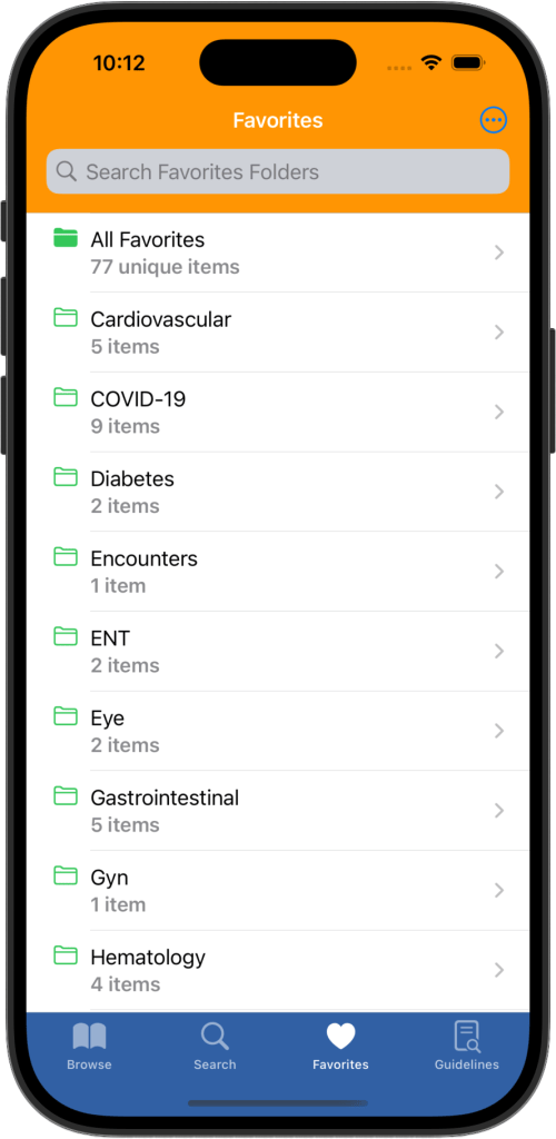 You can save frequently used ICD-10-CM billable codes to the app’s Favorites library. Favorite codes can be organized into an unlimited number of folders that you create and name. A code may be stored in multiple folders. The app provides an All Favorites folder that displays all the unique codes stored in the Favorites library. You cannot delete or rename the All Favorites folder. Optionally, Favorites library codes and folders can be automatically synced across your devices via iCloud.