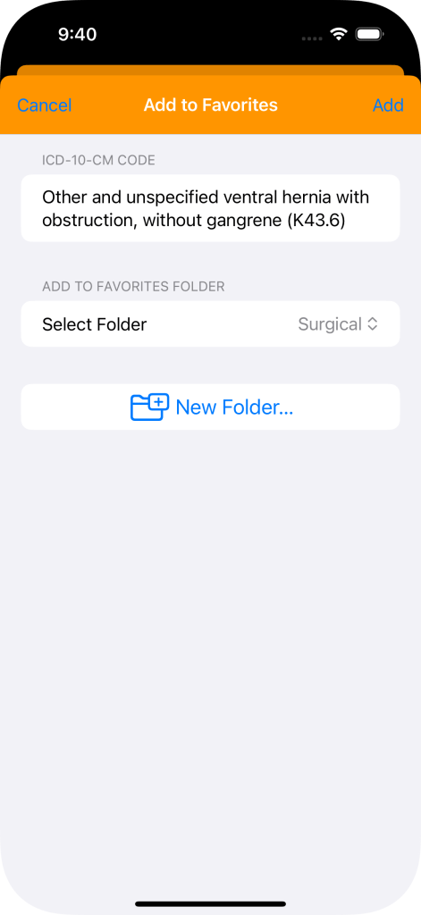 The panel displays the ICD-10-CM code that you wish to save. Tap on Select Folder to select the folder into which you will save the code. To create a new folder tap on New Folder, enter the new folder’s name and tap Save Folder. The newly created folder will become the selected folder. To save the code into the selected folder tap Add in the top right corner of the panel or tap Cancel. Repeat the process to save the code to additional folders. After you save a code to the Favorites library the Add to Favorites button will display the number of folders containing the code.