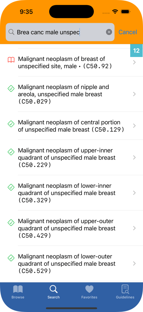 The search engine will automatically translate many commonly used medical terms to the equivalent terms used in ICD-10-CM. For example, enter “breast cancer” and you will see “Malignant neoplasm of breast”.