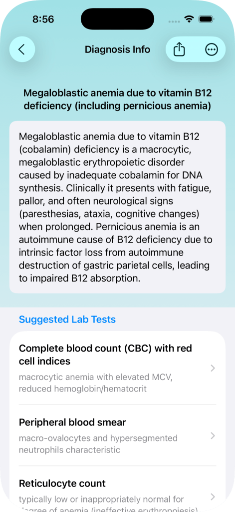 TestDx will display a list of diagnoses suggested by the lab test results entered. Select a diagnosis to view additional information. Share the list via email, AirDrop or Clipboard.